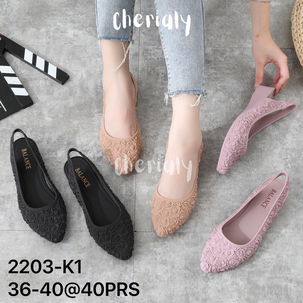 BALANCE Sandal Jelly Wanita Import Hak 3 Cm Bahan Karet Empuk Elastis Motif Bunga Sol Tebal Non-Slip Balet Flatshoes Hak Pendek